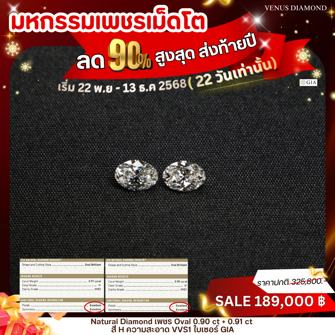 เพชร Oval 0.90 ct + 0.91 ct สี H เพชรขาวน้ำ 98 ความสะอาด VVS1