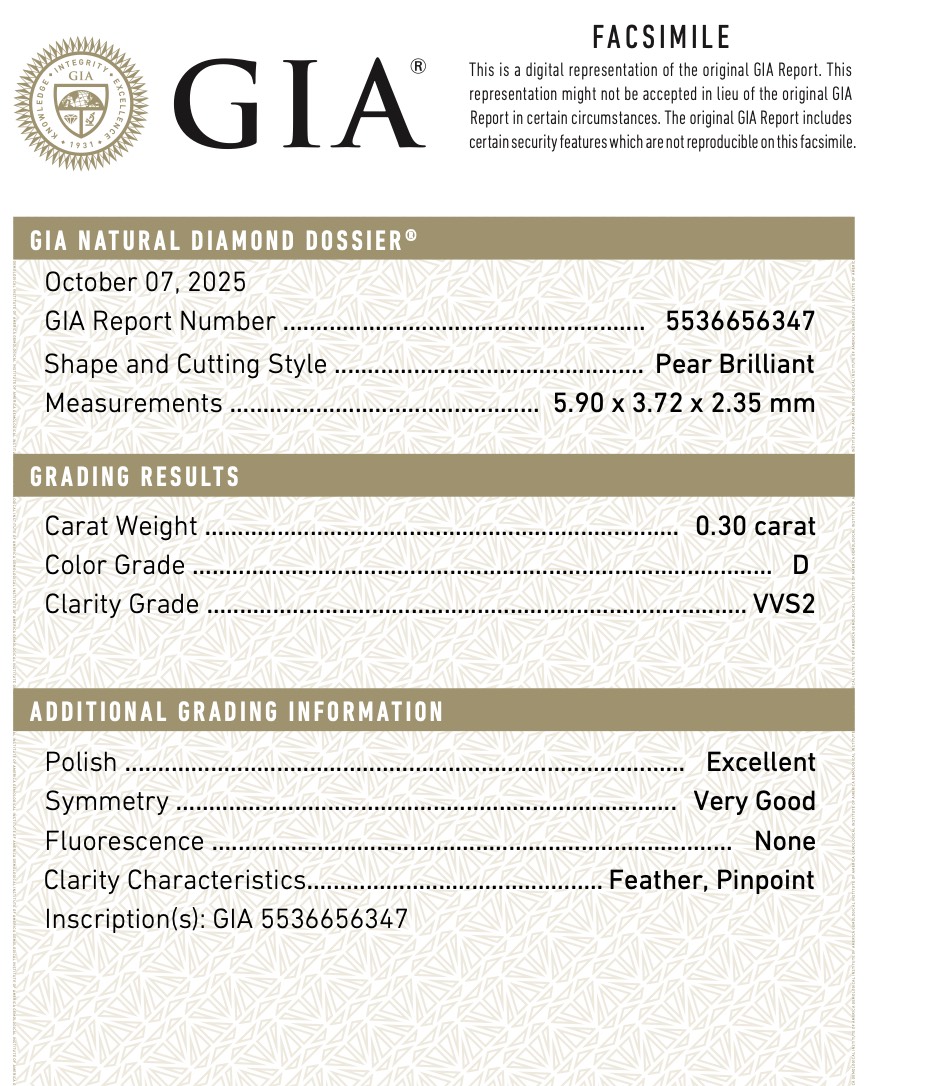 3. Pear 0.30 ct สี D VVS2 1X1VG N GIA 5536656347 ราคาเต็ม 27,720 บาท ราคาขาย 21,000 บาท