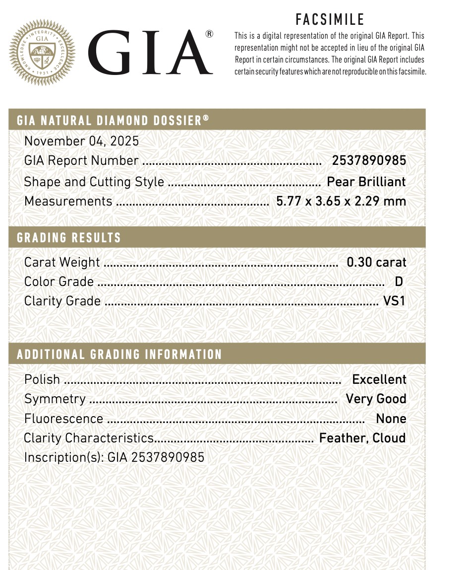 1. Pear 0.30 ct สี D VS1 1X1VG N GIA 2537890985 ราคาเต็ม 22,800 บาท ราคาขาย 17,000 บาท