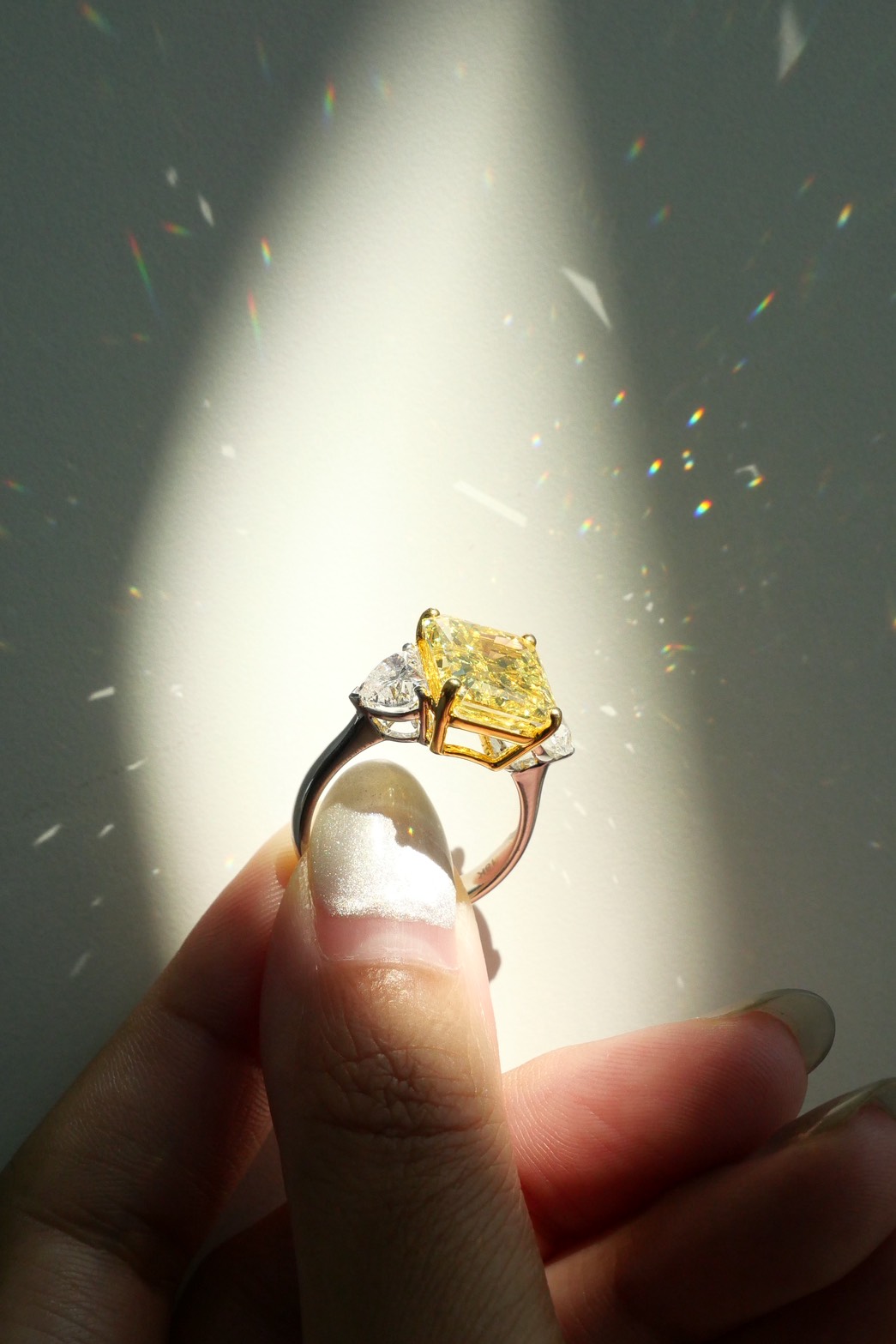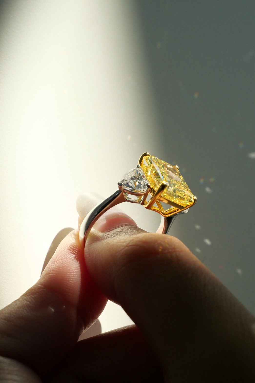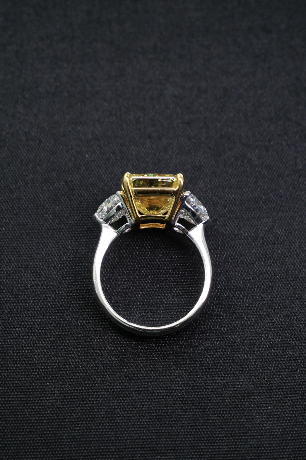 Radiant 6.71 ct Fancy vivid yellow ใบเซอร์ GIA 5212441674 Heart 2 pcs 0.70 ct สี E F น้ำ 99-98 ความสะอาด VVS VS