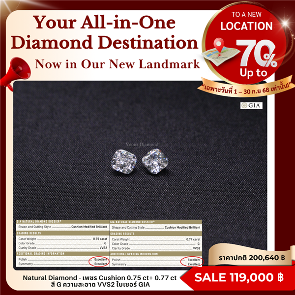 เพชร Cushion 0.75 ct+ 0.77 ct สี G ความสะอาด VVS2 ใบเซอร์ GIA