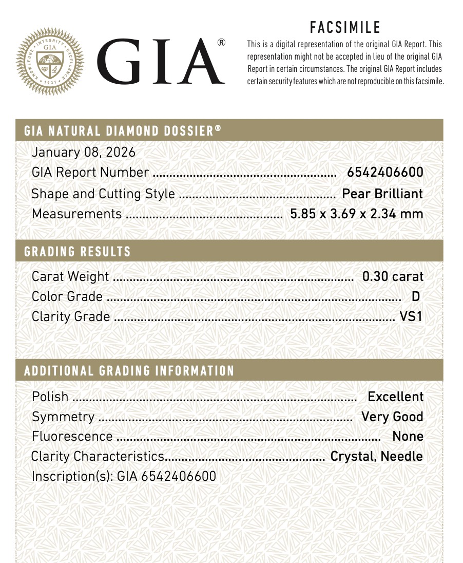 18) Pear 0.30 ct D VS1 1X1VG N GIA 6542523096 ราคาเต็ม 22,800 บาท ราคาขาย 16,000 บาท