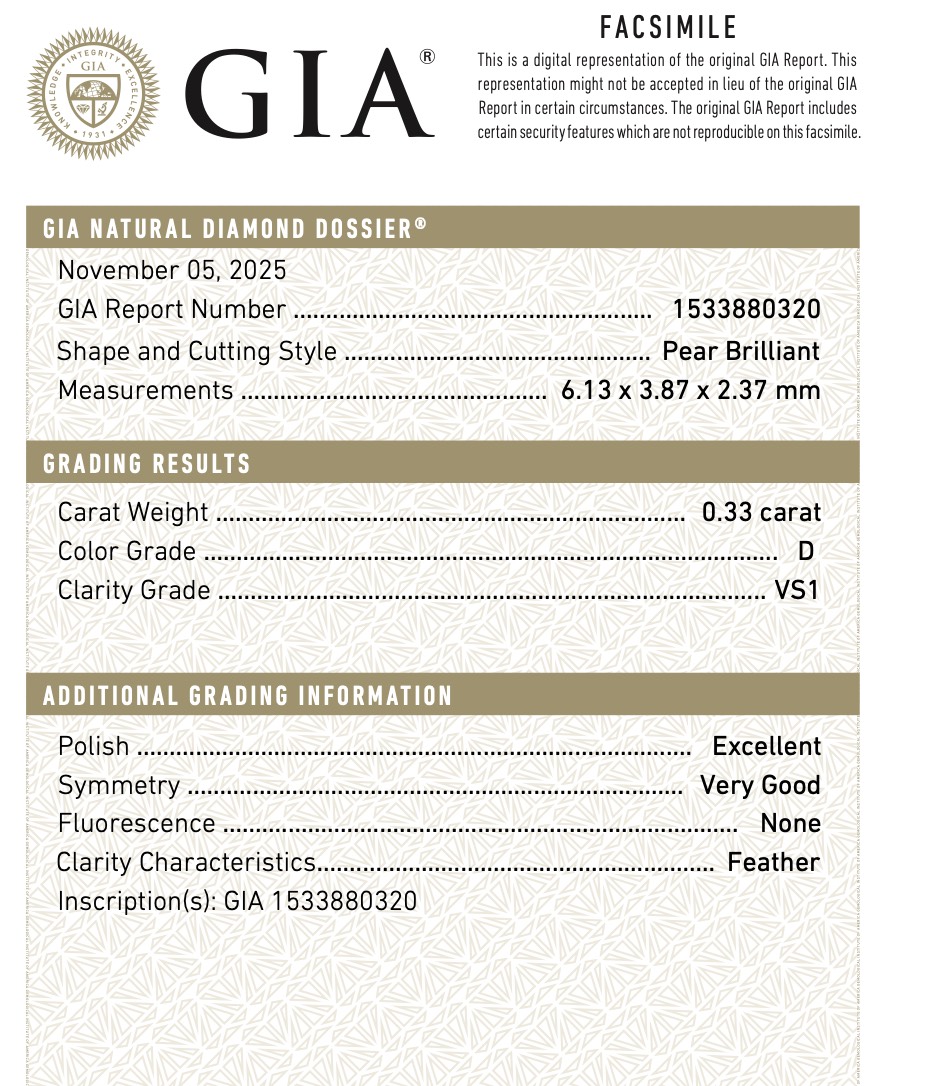 12) Pear 0.33 ct D VS1 1X1VG N GIA 1533880320 ราคาเต็ม 25,080 บาท ราคาขาย 17,000 บาท