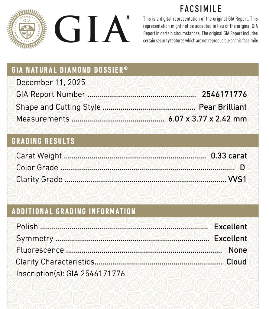 16) Pear 0.33 ct D VVS1 2X N GIA 2546171776 ราคาเต็ม 30,360 บาท ราคาขาย 21,000 บาท