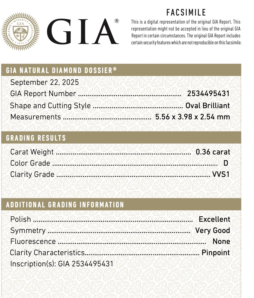 19) Oval 0.36 ct D VVS1 1X1VG N GIA 2534495431 ราคาเต็ม 33,120 บาท ราคาขาย 22,000 บาท
