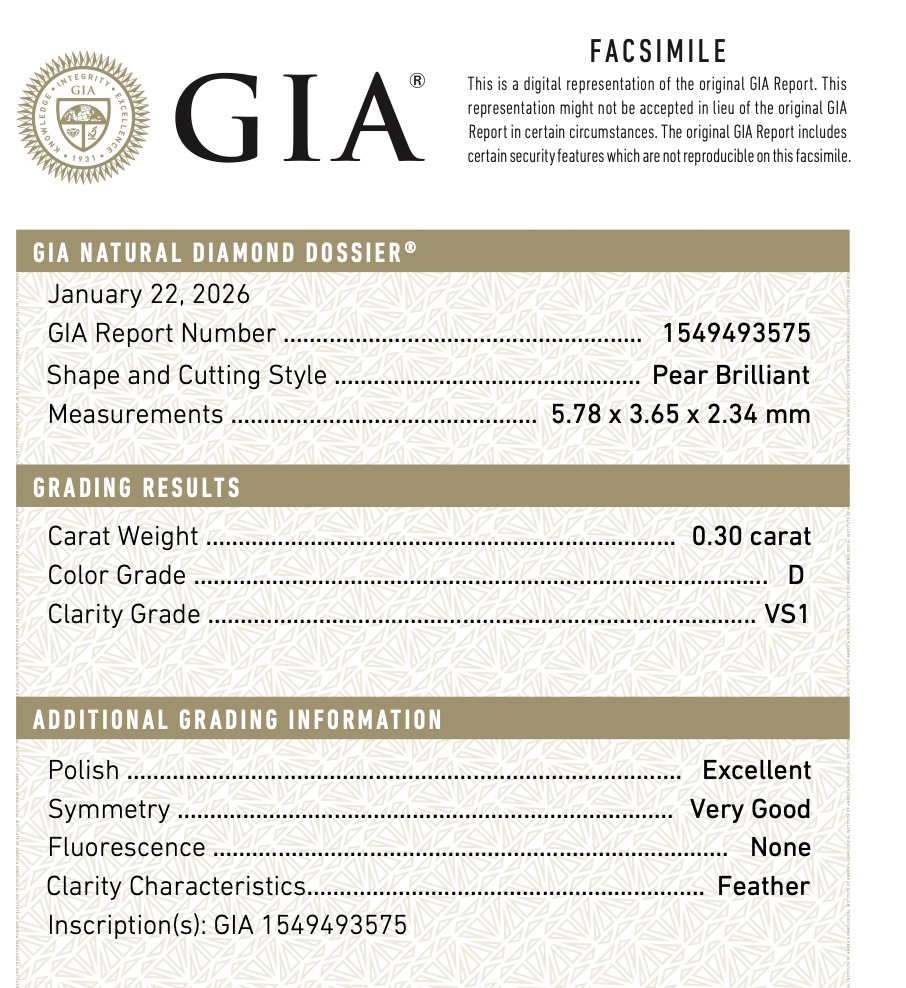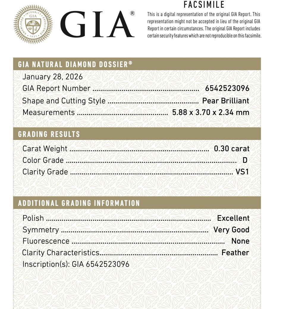 14) Pear 0.30 ct D VS1 1X1VG N GIA 6542406600 ราคาเต็ม 22,800 บาท ราคาขาย 16,000 บาท