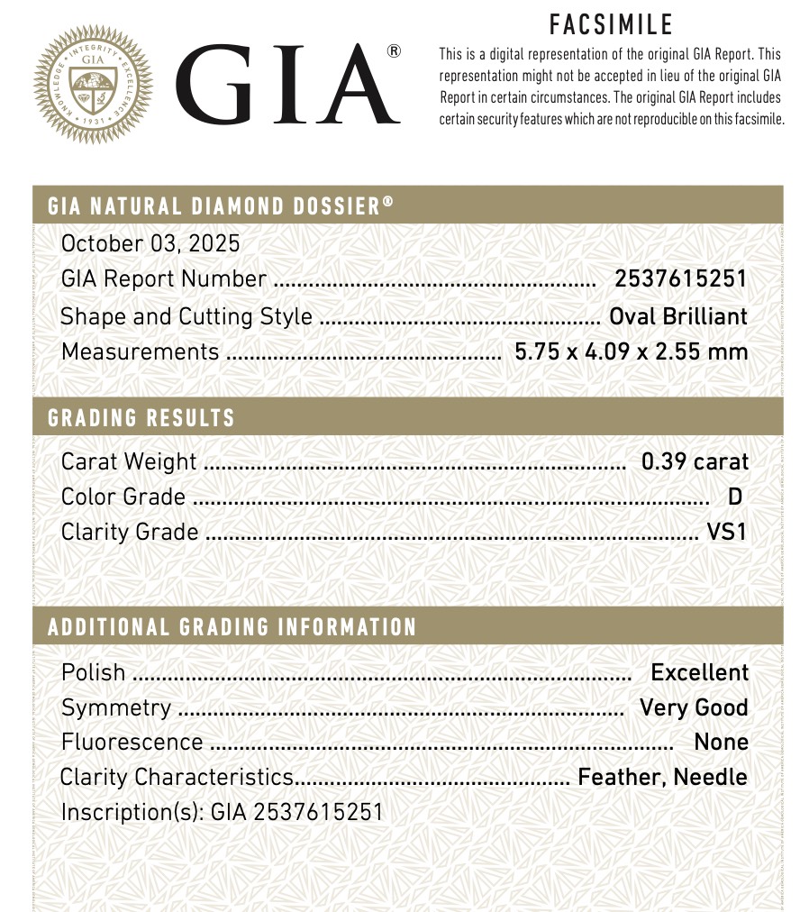 6) Oval 0.39 ct D VS1 1X1VG N GIA 2537615251 ราคาเต็ม 29,640 บาท ราคาขาย 20,000 บาท