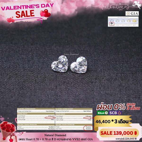 เพชร Heart 0.70 ct+0.70 ct สี D ความสะอาด VVS2 ใบเซอร์ GIA