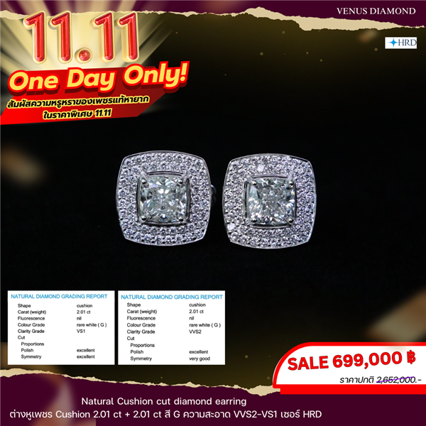 ต่างหูเพชร Cushion 2.01 ct + 2.01 ct สี G ความสะอาด VVS2-VS1 เซอร์ HRD