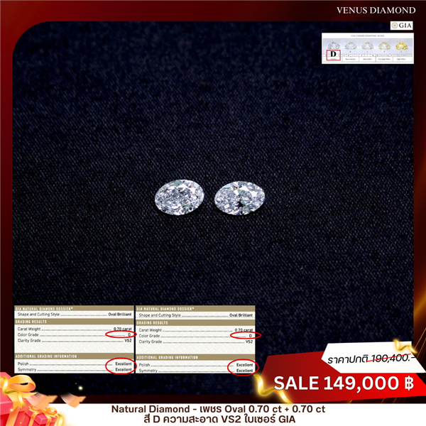 เพชร Oval 0.70 ct +0.70 ct สี D ความสะอาด VS1-VS2 ใบเซอร์ GIA