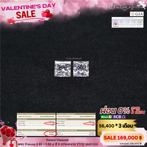 เพชร Princess 0.80 ct +0.80 ct สี D ความสะอาด VVS2 ใบเซอร์ GIA