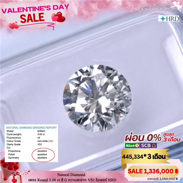 เพชร Round 3.00 ct สี G ความสะอาด VS1 ใบเซอร์ HRD