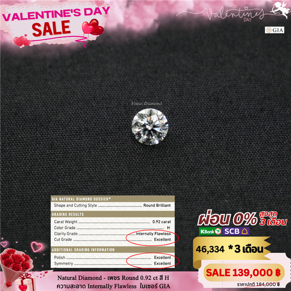 เพชร Round 0.92 ct สี H ความสะอาด IF ใบเซอร์ GIA